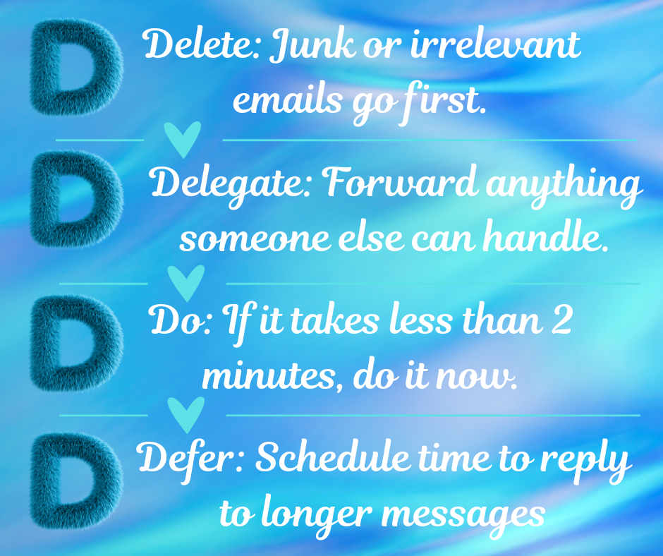 1. The 4D Method: Delete, Delegate, Do, Defer This simple system helps you process emails quickly: